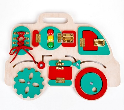 Развивающая доска для детей разработана по методике Марии Монтессори и представляет собой фанеру, на которой расположено множество интересных элементов, окружающих нас в быту: колесики, замочки, шнуровка, щеколда, дверки и др. Это самый настоящий развивающий центр для малыша, который займёт его на долгое время и отвлечёт от всех других занятий и игрушек. Задача ребёнка во время игры в бизиборд – исследовать все мелкие детали, прикреплённые к доске, понять опытным путём, для чего они нужны, запомнить тактильные ощущения и найти решение к каждой головоломке.