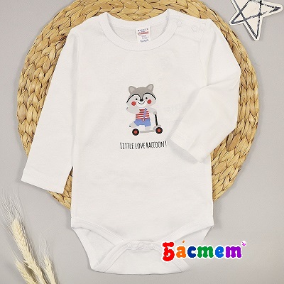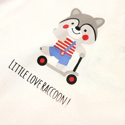 - на груди забавный енот на самокате.