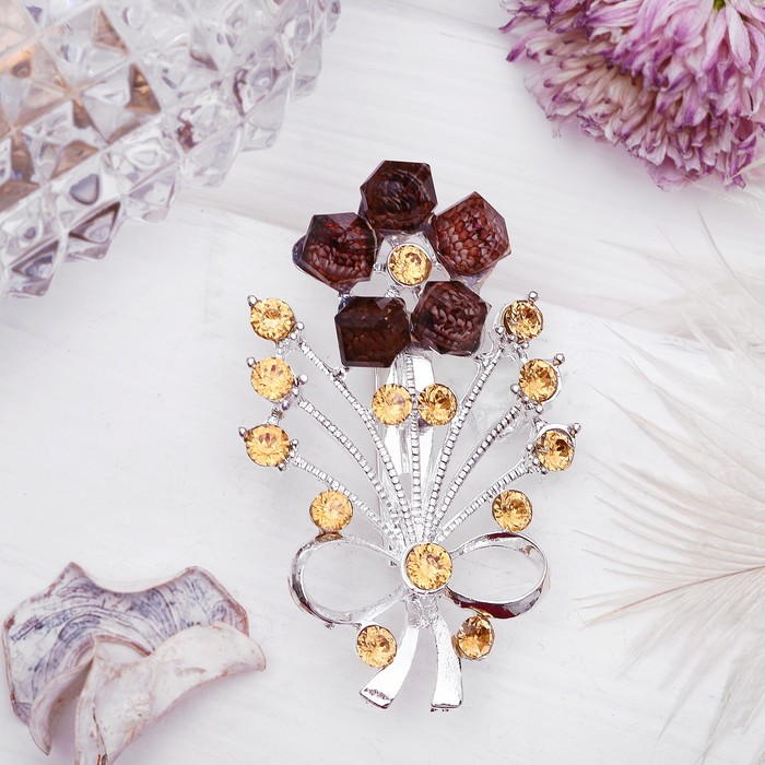 Брошь "Цветы", букет, цвет коричневый в серебре 1354618