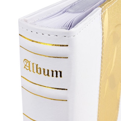 Состоит из 50 бумажных листов размером 15,5х21 см с карманами и вмещает 200 фотографий размером 10х15 см, по 2 штуки на странице. Обложка фотоальбома скомбинирована из материала под кожу белого цвета и золотистой вставки с рельефным рисунком. Фотоальбом с книжным переплетом отличается повышенной прочностью и долгим сроком службы. Размер - 20,7х21,8 см.