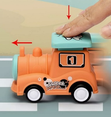 Все машинки с инерционным механизмом движения - при нажатии кнопки сверху поезда - она самостоятельно начинает ехать вперед. Батарейки не требуются!