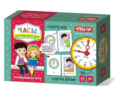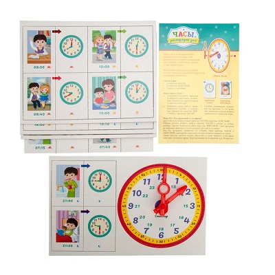 Игра «Часы и распорядок дня» незаменимый помощник для родителей желающих познакомить своих детей с понятиями «время» и «распорядок дня»! Чаще всего малыши трудно ориентируются по обычным часам и им нелегко определить время. На помощь в обучении придут веселые часики с вращающимися стрелками и специальные карточки с игровыми заданиями. Рассмотрите часы вместе с ребёнком и расскажите ему, как ими пользоваться. После того как малыш научится определять время, переходите к двусторонним карточкам. На каждой есть задания, которые крохе нужно выполнить с помощью картонных часов из набора. В составе игры: часы со стрелками, 14 карточек часов и 14 карточек действий. Для детей от 3-х лет. Формирует элементарные представления о времени, цифрах, распорядке дня. Развивает внимание, память, мышление.