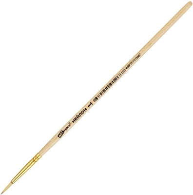 Художественная кисть ArtSpace из нейлона - это недорогой вариант для школьников, где редко пользуются акрилом и маслом, чаще гуашью и акварелью. Она идеальна для начинающих художников, поэтому их часто используют в детских образовательных учреждениях. Кисть круглой формы с короткой ручкой из дерева также подходит для малышей.