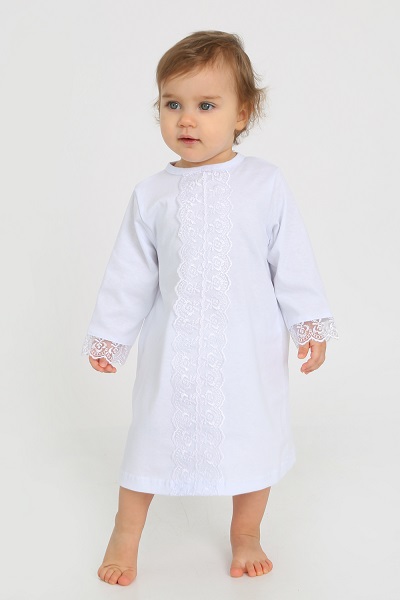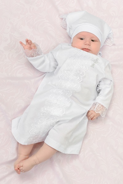 Крестильный набор для девочки Белоснежное платье, украшено белым красивым кружевом и серебряным крестиком и косынка с кружевом на трикотажной манжете. Отличный вариант для первого торжества - таинства крещения. Выполнен из мягкой и приятной на ощупь трикотажной ткани, которая подарит максимальный комфорт в ваш светлый праздник. Размер 80.