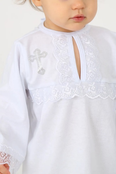 Белоснежное платье, украшено белым красивым кружевом и серебряным крестиком. Отличный вариант для первого торжества малыша - таинства крещения. Подойдет как для мальчика, так и для девочки. Выполнен из мягкой и приятной на ощупь трикотажной ткани, которая подарит максимальный комфорт в ваш светлый праздник. Размер 86 см.