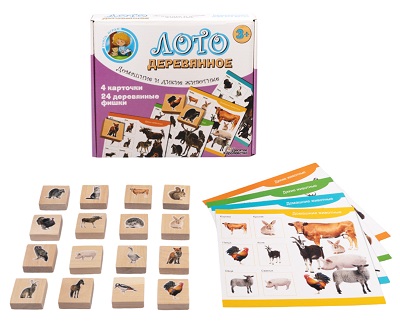 Это тематическое лото с деревянными фишками познакомит малышей с «Домашними и дикими животными», рекомендуется для детей от 3-х до 5 лет и рассчитано на 2 или 4 участников. Как и многие другие аналогичные игры с картинками, оно помогает развить у ребенка зрительную память и внимание.