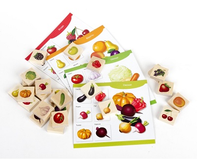- 4 картонные карточки (16х14,5 см) по 6 картинок на каждой, тематика: овощи – 2 шт, фрукты – 1 шт, и ягоды – 1 шт;
