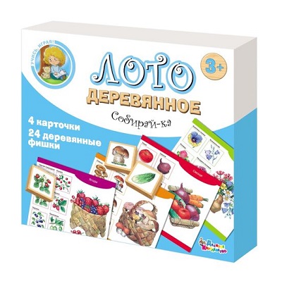 Это тематическое лото познакомит малышей с тем, какие цветы растут на клумбах, какой урожай можно собрать в саду, на огороде и в лесу. Оно рекомендуется для детей от 3-х до 5 лет и рассчитано на 2 или 4 участников.