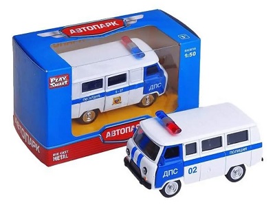 Инерционная машина «Уаз 39625 Полиция ДПС» выполнена точной уменьшенной копией реального автомобиля в масштабе 1/50. Кузов модели выполнен из металла, реалистично исполненный салон из пластика. У коллекционной модели открываются передние двери, кузов имеет цвет белый-синий и крашен надписью «ДПС».