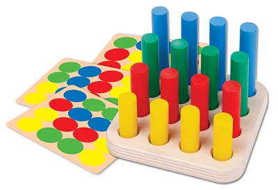 • деревянные столбики 4 цвета – 16 шт. (синий, длина – 7 см, зелёный, длина – 6 см, красный, длина – 5 см, желтый, длина – 4 см, диаметр каждого столбика – 1,8 см)