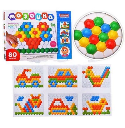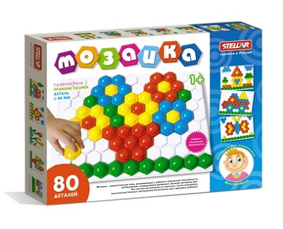 Открыв коробку с веселой надписью "Мозаика" ребенок обнаружит игровое поле белого цвета, на котором проделаны 80 одинаковых отверстий. С помощью специальных фишек, диаметр которых составляет 4 см, ребенок сможет создавать различные рисунки. На коробке приведены примеры собранной мозаики, которые малыш сможет повторить.