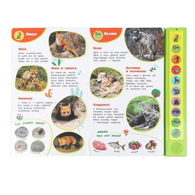 Эта книга - настоящая говорящая энциклопедия, которая познакомит малыша с обитателями леса и их голосами. Ребенок с удовольствием будет рассматривать картинки, слушать стихи про животных, отвечать на занимательные вопросы и нажимать на звуковые кнопки. Одно нажатие на кнопку – включится звук, второе нажатие – выключится. Книжка сделана из плотного картона, поэтому родители могут не опасаться за её сохранность.