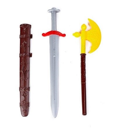 Игровой набор "Ратник 2" включает в себя несколько видов игрушечного средневекового оружия.