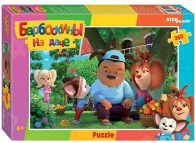 Пазл «Барбоскины» состоит из 260 деталей. На его картинке нарисованы Малыш и Лиза, которые играют с Тимохой. Вдалеке за ними наблюдает Роза. Характеристики пазла: - стандартные детали пазла (2×1,7 см); - размер собранного изображения - 24*34,5 см; - материал – картон; - качественное изображение; - экологически чистые, нетоксичные материалы (компания Step Puzzle гарантирует высокое качество пазла и точность подгонки). Для кого? Пазл подходит для детей от 6 лет. Пазл «Барбоскины» оценят и взрослые, и дети, он обязательно понравится всем фанатам историй о жизни этих собчаек. Для комфортной сборки пазла советуем приобрести специальный коврик. Рекомендуем приобрести специальный клей для пазлов, чтобы скрепить детали мозаики между собой и получить цельную картину.