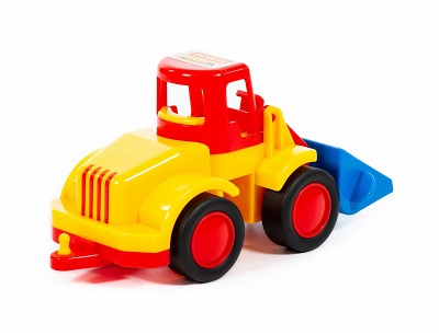 Трактор-погрузчик имеет подвижный ковш, а для удобства управления предусмотрена специальная ручка на рукоятке ковша. Колёса погрузчика — с резиновыми накладками, что обеспечивает практически бесшумное катание игрушки на любой поверхности. А наличие буксировочной петли позволяет возить машинку за собой на верёвочке.