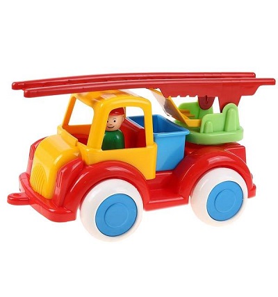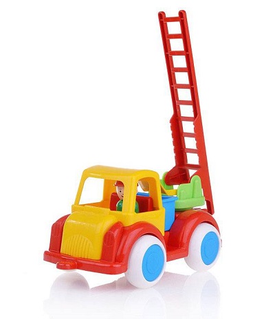 Тяжелые колеса пожарной машины из ПВХ, играют роль инерционного движителя. Лестница поворачивается и поднимается, человечек вытаскивается.