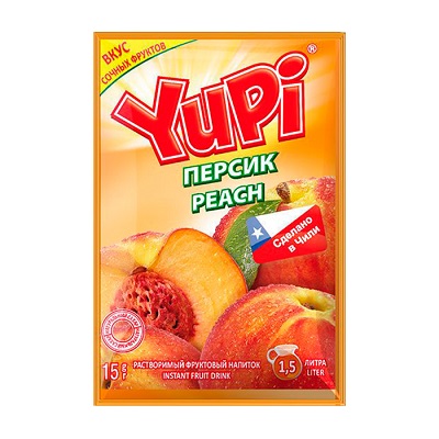 Юпи - напиток для ностальгирующих любителей вкусняшек, который перенесет вас в юность. Если вы из таких, то Yupi со вкусом персика - это то, что Вам нужно! Растворимые напитки также идеально подходят на праздники для больших компаний и в жаркие летние дни. Для приготовления Yupi растворите содержимое одного пакетика в 1,5 литре холодной питьевой воды. По желанию можно добавить лёд. Растворимый напиток Yupi персик 15 г.