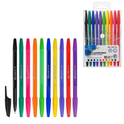 Набор шариковых ручек с чернилами на масляной основе: цветной корпус в цвет чернил корпус, в пластиковой упаковке на кнопке с европодвесом; 0,7 mm 10 цветов.