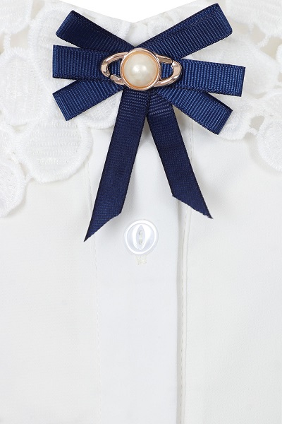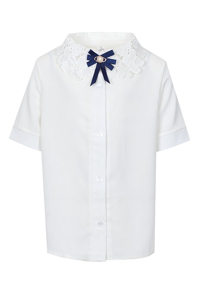 Лёгкая однотонная рубашка на девочку с короткими рукавами выполнена из полиэстера. Прямой крой обеспечивает комфортную посадку. Изделие с манжетами на пуговицах и отложным ажурным воротником. Застёгивается спереди на пуговицы, воротник украшен бантом. Не сковывает движения. Лёгкая ткань. Размер 34-42.