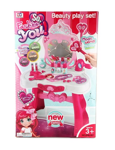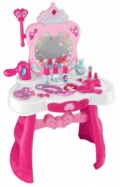 Трюмо" - детский набор, в котором есть все необходимое для поддержания красоты маленькой модницы. Устойчивый столик с зеркалом оформлен в бело-розовых тонах и дополнен декоративными элементами в виде бантика, короны и сердечек. Он также обладает небольшим выдвижным ящичком для хранения украшений и игрушечной косметики, входящих в комплект: браслетов, бус, колечек, лаков для ногтей, помад и других принадлежностей. Кроме того, трюмо оснащено звуковыми эффектами и подсветкой, что несомненно порадует его обладательницу.