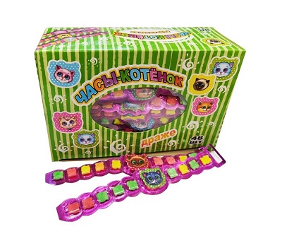 Сахарное драже в упаковке в виде часов. Драже Часы-Котенок можно надеть ребенку на руку и лакомиться конфетками в любое удобное время.