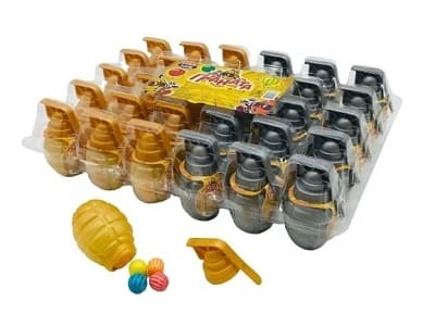 Жевательная резинка в упаковке в виде гранаты с разноцветными драже разных цветов и вкусов.