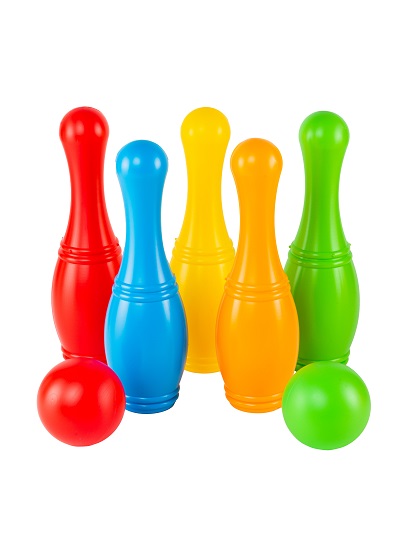 В комплект входит 5 красочных разноцветных кеглей и два цветных пластмассовых мячика.