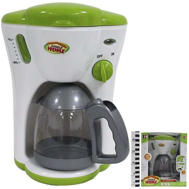 Игрушечная кофеварка прекрасно дополнит детскую кухню и станет неотъемлемым атрибутом веселых игр. Внешний вид кофеварки очень реалистичен, а конструкция напоминает настоящую технику: верхняя крышка открывается - внутрь можно залить воду, которая затем перетекает в чайник; переключатель можно поставить в два положения, а кувшин кофеварки также можно открыть. Игрушка оснащена световыми и звуковыми эффектами, питание от 2 батареек типа АА на 1,5 V (не входят в комплект).