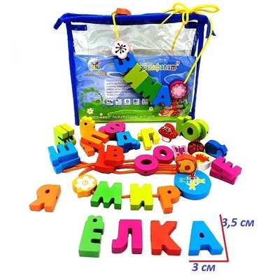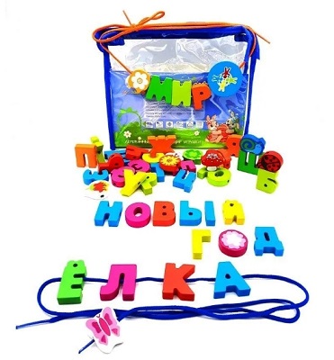 Занимательная обучающая игра для детей. Шнуровка-бусы Цветной алфавит - это набор из 66 букв русского алфавита, который комплектуется цветными бусинами в виде цветов,бабочка, грибок, божья коровка, улитка. Два ярких шнурка для создания оригинальной цепочки.