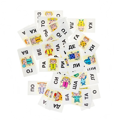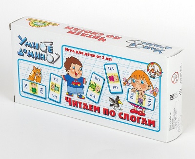 В состав умного домино «Читаем по слогам» входят 36 карточек, каждая из них разделена на две части. На каждой половинке написан слог. Смысл этой игры заключается в том, чтобы в игровой форме, участники игры складывали слова. Например: первый игрок выложил карточку со слогами РАН и ДУ, второй игрок может выложить (одну или две) свои карточки, таким образом, чтобы из слогов получилось слово БАРАНКА.