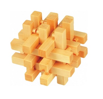 Игрушка изготовлена из экологически чистой древесины. Головоломка состоит из деталей в виде брусков квадратного сечения со штырьками и прорезями. Их надо собрать таким образом, чтобы получилась фигура, показанная на рисунке. Игра с такой головоломкой способствует развитию у ребенка логического, творческого и пространственного мышления, координации движений, внимания, усидчивости, моторики пальчиков.