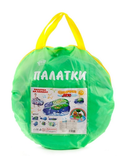 Дверь расположена спереди, окно с сеткой – сзади. На дне палатки сделаны отверстия для ног, добавлены наплечные ремни. Ребёнок может "надеть" палатку на себя. Упаковка представляет собой сумку на молнии c прозрачным карманом для цветного вкладыша. На вкладыше имеется инструкция по сборке.