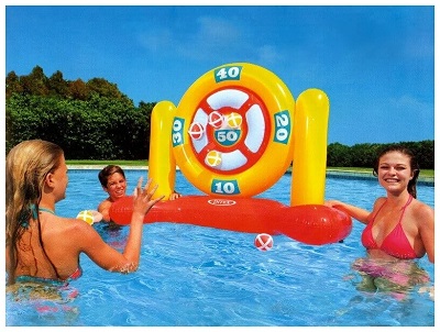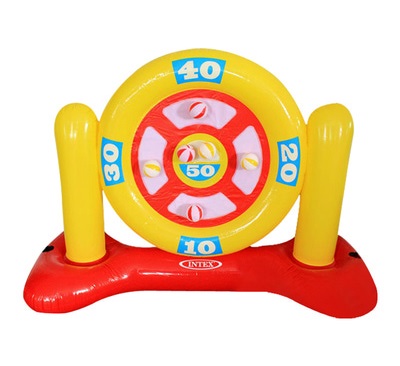 Игровой надувной набор "ДАРТС" представляет собой плавающий развлекательный комплекс для бассейнов, состоящий из надувной мишени и мячиков для метания с липучками.