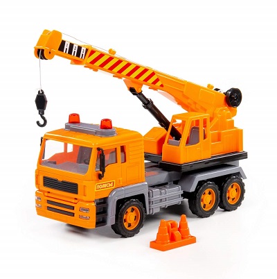 Автомобиль-кран «Алмаз» - это интересный вид техники, представленный в данной серии. Игрушка имеет подвижную поворотную платформу, а также выдвижную стрелу с крюковой подвеской, которую можно поднимать и опускать с помощью ручного механизма. Конструкция крана предполагает наличие трёх пар колёс, а в комплекте с игрушкой идут строительные конусы, которые разнообразят и дополнят игру!