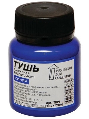 Водостойкая тушь из сажи в растворе полимера, не смывается после высыхания, имеет густой цвет и легко сходит с пера или рейсфедера. Широкое горлышко и достаточный объем флакона, позволяют легко обмакнуть перо или рейсфедер. Тушь используют для графических, чертежных и оформительских работ.
