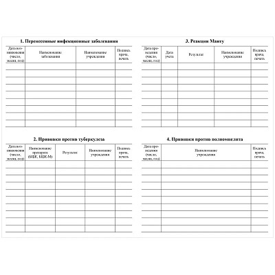 Книга для учета профилактических прививках. Обложка - бумага офсетная плотностью 120 г/м2. Внутренний блок - офсетная бумага плотностью 65 г/м2. Вид крепления - скрепка.