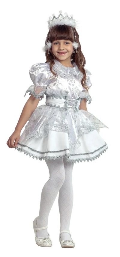 Детский праздничный костюм «Снежинка» воплотит мечту в жизнь! Детский карнавальный костюм «Снежинка» подарит вашей девочке лёгкий и воздушный образ. В комплект новогоднего костюма входит белая атласная блузка с рукавами-фонариками, короткая юбочка, отделанная по краю серебряной тесьмой, и широкий, оригинальный пояс на шнуровке. Завершает образ снежинки красивая диадема с декоративными элементами. В таком карнавальном костюме, «Снежинка», ваша девочка получит максимальное удовольствие от праздника и подарит радость окружающим!