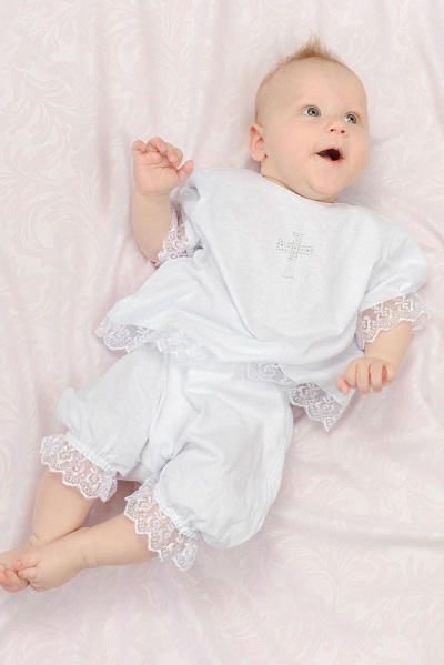 Крестильная рубашка - первое, во что одевают малыша после проведения таинственного обряда. Крестильный набор состоит из двух предметов: штанишки под памперс и рубашка, украшенная нежным кружевом. Конструкция рубашки простая и лёгкая, она не сковывает движения и обеспечит комфорт Вашего ребёнка. Имеет символичный принт в виде православного крестика на груди. Комплект для крещения быстро впитывает остатки влаги и сохраняет тепло благодаря своему составу из 100% хлопка (кулирка), предотвращает раздражение на коже и неприятные ощущения. Наряд для крещения универсален, подойдёт как для мальчика, так и для девочки. Размер 86.