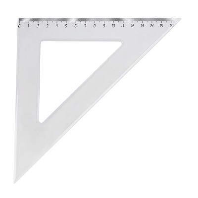 Треугольник изготовлен из прозрачного тонированного пластика. Деления шкалы пропечатаны отчётливо. Используется на уроках в школе, при построении графиков и чертежей. Длина: 16 см, разворот: 45 градусов.