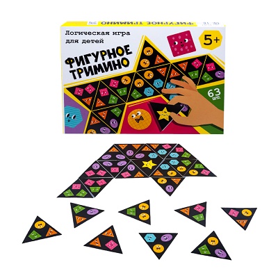 Логическая настольная игра для детей «Фигурное тримино» - это захватывающее приключение для самых внимательных и сообразительных. Тримино - аналог домино с фишками треугольной формы. В наборе есть карточки с изображением разноцветных геометрических фигур.