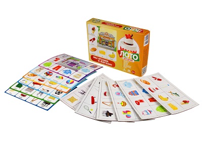 - 48 маленьких карточек размером 3,5x3,5 см с изображением различных товаров, соответствующих тематике магазинов.