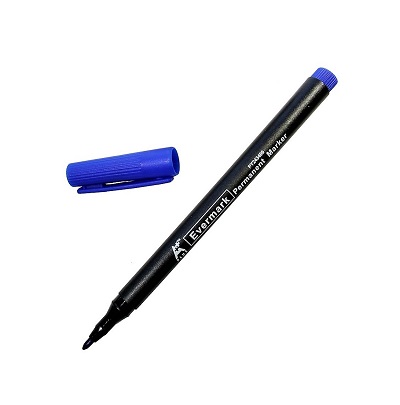 Маркер перманентный с круглым наконечником. Толщина линии письма 2мм. Нестираемые чернила для письма по стеклу, металлу, дереву, пластику.