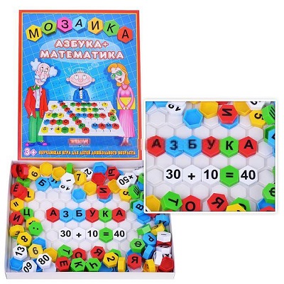 Мозаика «Азбука-математика» - это конструктор слов и примеров. На каждой фишке есть изображения буквы или цифры. Это позволяет изучать с детьми в игровой форме буквы и звуки, цифры и математические действия.