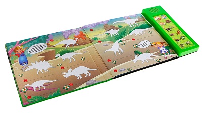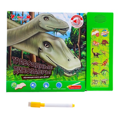 Расширить кругозор малыша поможет книга «Травоядные динозавры». Благодаря ей ребёнок узнает названия одних из самых первых животных на Земле. А с помощью специального маркера сможет написать название динозавра прямо рядом с картинкой. Также названия животных можно прослушать, нажав на специальную кнопочку.