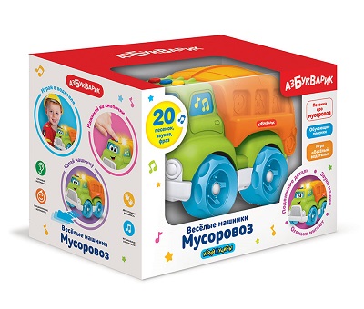 Большой мусоровоз спешит на работу и ждет своего водителя! Нажимая на кнопочки, малыш послушает настоящий хит про мусоровоз, познавательные песенки про счет, буквы и светофор. А главное – ребенок сможет поиграть, выполняя задания под музыку.