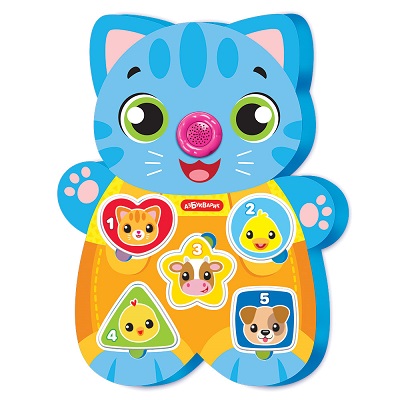 Вставляя мягкие фигурки в нужные окошки, малыш познакомится со зверятами, выучит цифры, формы и цвета. Играть под музыку еще интереснее! Нажимая на носик-кнопочку говорящего котенка, ребенок послушает забавные песенки, мелодии и задания в стихах. Задания нужно не только послушать, но и выполнить – найти среди фигурок нужную цифру, форму или зверюшку.
