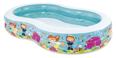 Надувной бассейн Райская лагуна с разноцветными внешними стенками и водоотводом в полу. Бассейн сделан из прочного винила, имеет 2 воздушные камеры с двойными клапанами. В нем могут купаться несколько детей и взрослых одновременно. В набор входит ремкомплект.