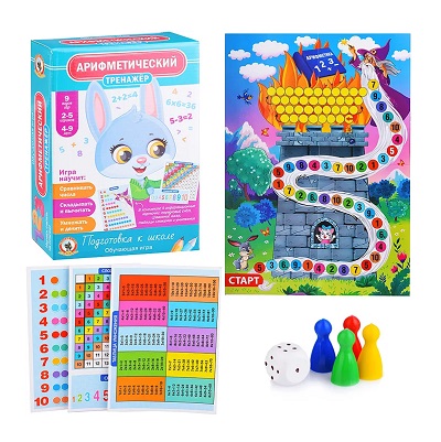 Серия обучающих игр «Тренажёры» – это эффективная многоступенчатая методика, многократно ускоряющая усвоение детьми учебного материала, изучаемого в дошкольном и младшем школьном возрасте. «Арифметический» тренажёр – это сюжетная обучающая игра, которая поможет детям сначала научиться порядковому счёту, сопоставлению цифр с количеством объектов и сравнению чисел, а затем познакомиться со сложением и вычитанием чисел в пределах 10, выучить таблицу умножения и с лёгкостью решать простейшие уравнения на сложение, вычитание, умножение и деление. Методика занятий позволяет взрослому контролировать информационную нагрузку на каждого из участников. В правилах описаны 9 видов игр разной сложности: от простого порядкового счета до решения простейших уравнений. Игра рекомендована как для индивидуальных занятий с детьми, так и занятий в группе. Для 2–5 игроков. Возраст 4 – 9 лет.