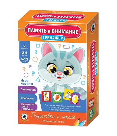Серия обучающих игр «Тренажёры» – это эффективная многоступенчатая методика, многократно ускоряющая усвоение детьми учебного материала, изучаемого в дошкольном и младшем школьном возрасте. Тренажёр «Память и внимание» разовьёт у детей зрительную и слуховую память, что поможет успешнее учиться в школе, тратить меньше времени на выполнение домашних заданий и никогда не волноваться на контрольных и экзаменах. Игра поможет повторить такие темы, как обобщающие слова, цвета и геометрические фигуры. Игровое поле представляет собой двухуровневый лабиринт, выбраться из которого помогут память и внимание. В комплект входит 30 обучающих карточек с картинками, цветами и геометрическими фигурами. В правилах описаны два вида игры: для развития зрительной памяти и для развития слуховой памяти. Игра рекомендована как для индивидуальных занятий с детьми, так и занятий в группе. Для 2 – 4 игроков. Возраст 5 – 12 лет.