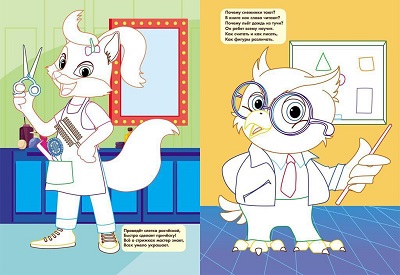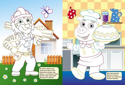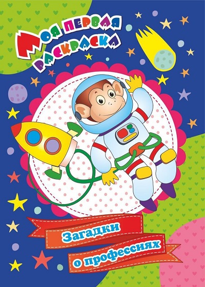Крупные изображения, широкие цветные контурные линии, а также цветной образец подскажут в случае затруднений и помогут получить удовольствие от раскрашивания. Ребёнок может повторять предложенную цветовую гамму или создавать свою. А настроят на это интересное занятие весёлые загадки, размещённые под каждым рисунком. Они познакомят малыша с миром профессий и расскажут о том, чем занимаются парикмахер, дворник, учитель, космонавт, военный, строитель, доктор, повар. Прочитайте вместе стихотворение-загадку, предложите малышу догадаться, о ком идет речь, рассмотрите рисунок, побеседуйте с малышом о том, что изображено, и наслаждайтесь творчеством.